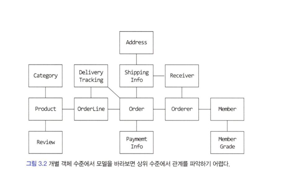 - 위 처럼 백 개 이상의 테이블을 위처럼 ERD(Entity Relationship Diagram)로 모두 표시하면 테이블관의 관계를 파악하느라 큰 틀에서 데이터 구조를 이해하는데 어렵다. 도메인 객체 모델이 복잡해지면 개별 구성요소 위주로 모델을 이해하고 전반적인 구조나 큰 수준에서 도메인 간의 관계를 파악하기 어려워진다.