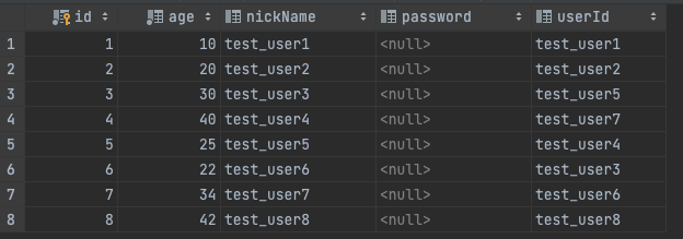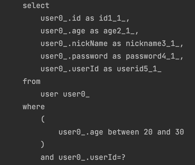 - 위처럼 테스트 코드를 작성했다. 위에 Specfication을 모아둔 UserSpecs클래스에 나이 specfication을 만든 후 Service 메소드에 넘기면 Repository에 넘겨서 데이터를 리턴받는다. 위 처럼 쿼리가 잘 동작 되었다.