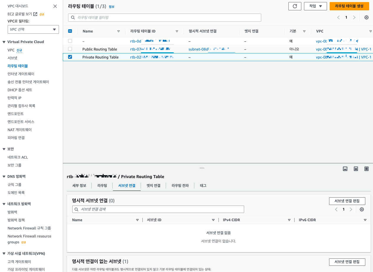 22. 라우팅 테이블 선택 -> 생성한 Private Routing Table 체크박스 클릭 -> 서브넷 연결 탭 선택 -> 서브넷 연결 편집