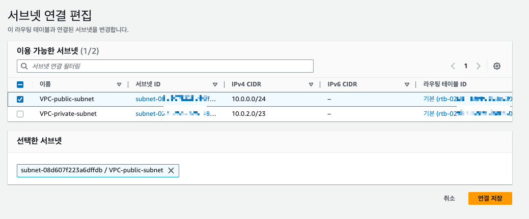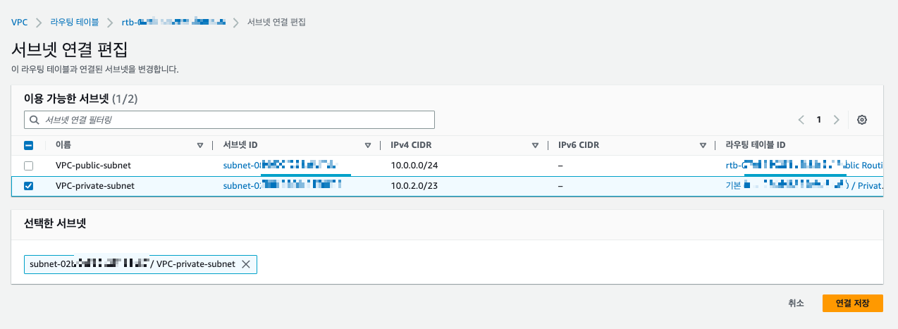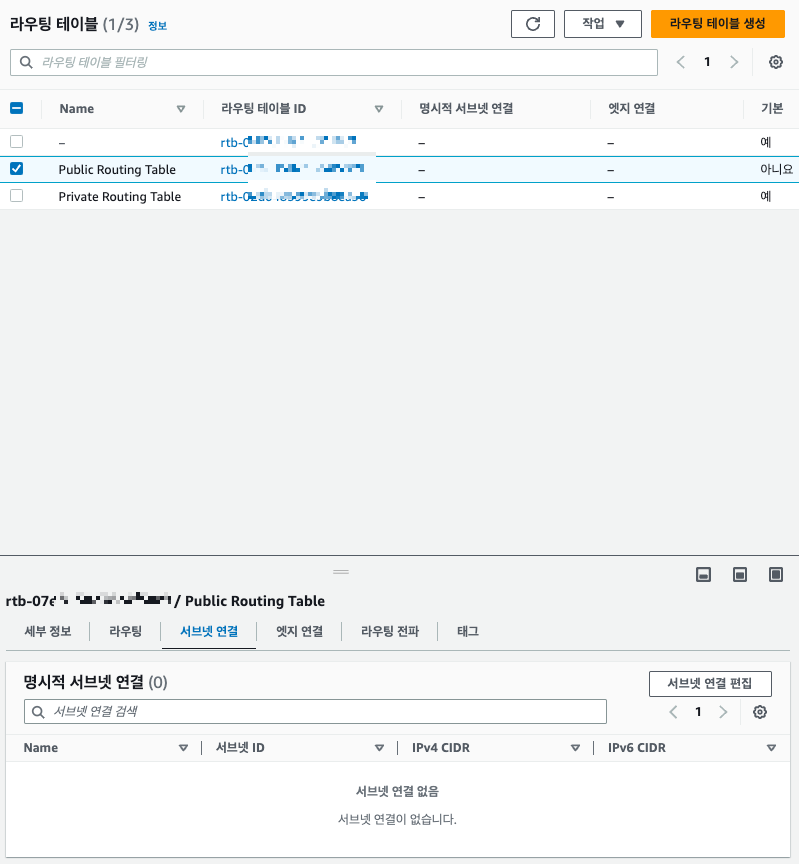 16. 다시 라우팅 테이블 리스트 화면 -> 체크 박스 클릭시 밑에 편집화면 노출 -> 서브넷 연결 클릭