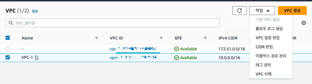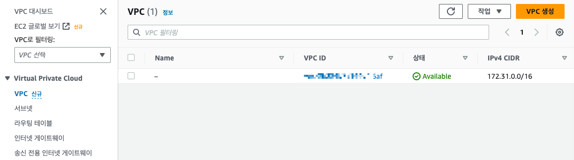 1. default vpc가 있다. 무시하고 vpc 생성 클릭