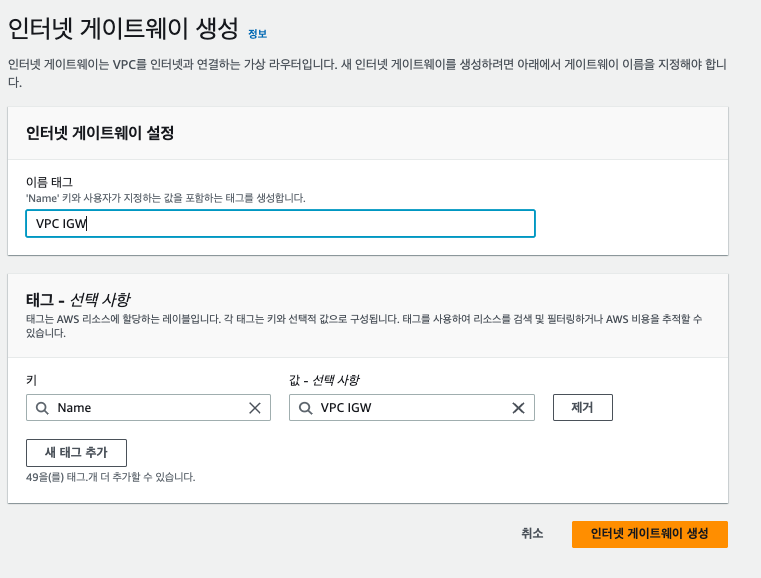 10. 인터넷 게이트웨이 생성 클릭 -> 이름 태그 작성 -> 생성