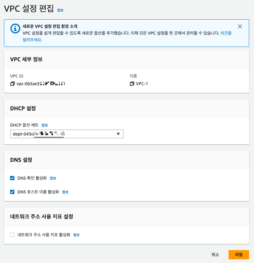 3. 만든 vpc 체크박스 클릭 -> 작업 클릭 -> VPC 설정 편집 클릭 -> DNS 설정 -> DNS 호스트 이름 활성화 클릭 후 저장