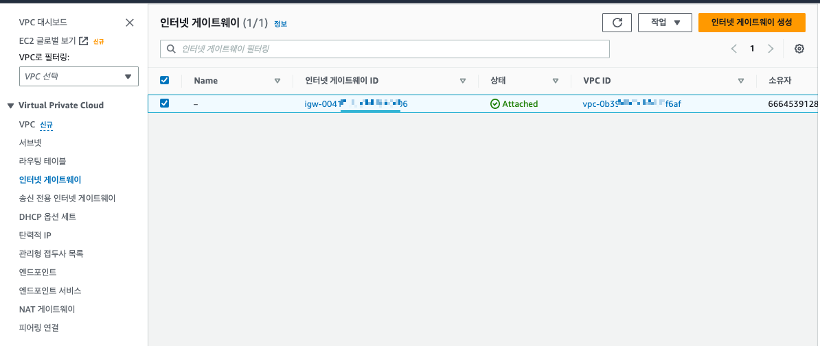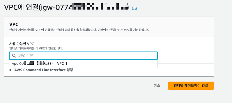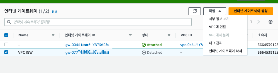 11. 생성한 인터넷 게이트웨이 클릭 -> 작업 클릭 -> VPC에 연결 클릭 -> 만든 vpc 선택 후 연결