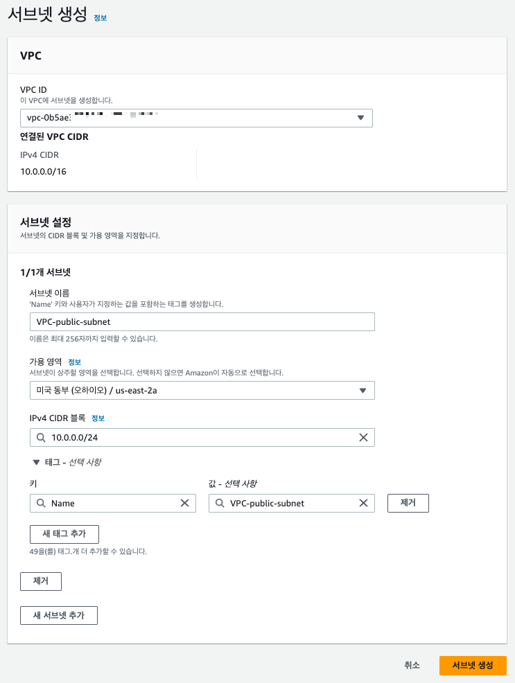 5. VPC ID에 위에서 만든 VPC 선택 -> 이름 입력 -> 가용 영역 2a로 선택 -> IPv4 CIDR 블록 10.0.0.0/24로 설정 -> 서브넷 생성