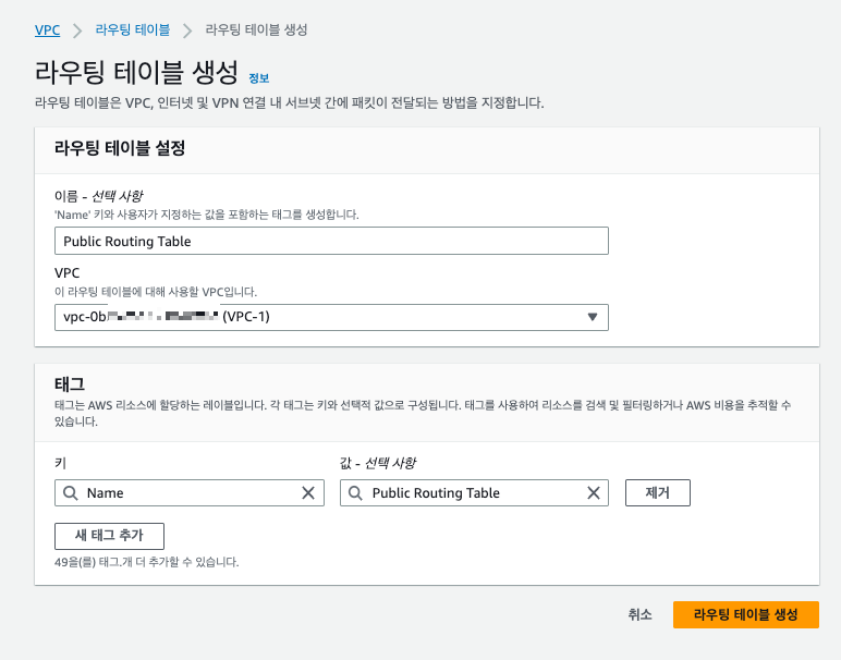 13. 퍼블릭 라우팅 세팅하기: 라우팅 테이블 생성 클릭 -> 이름 작성 생성한 VPC 선택 -> 라우팅 테이블 생성
