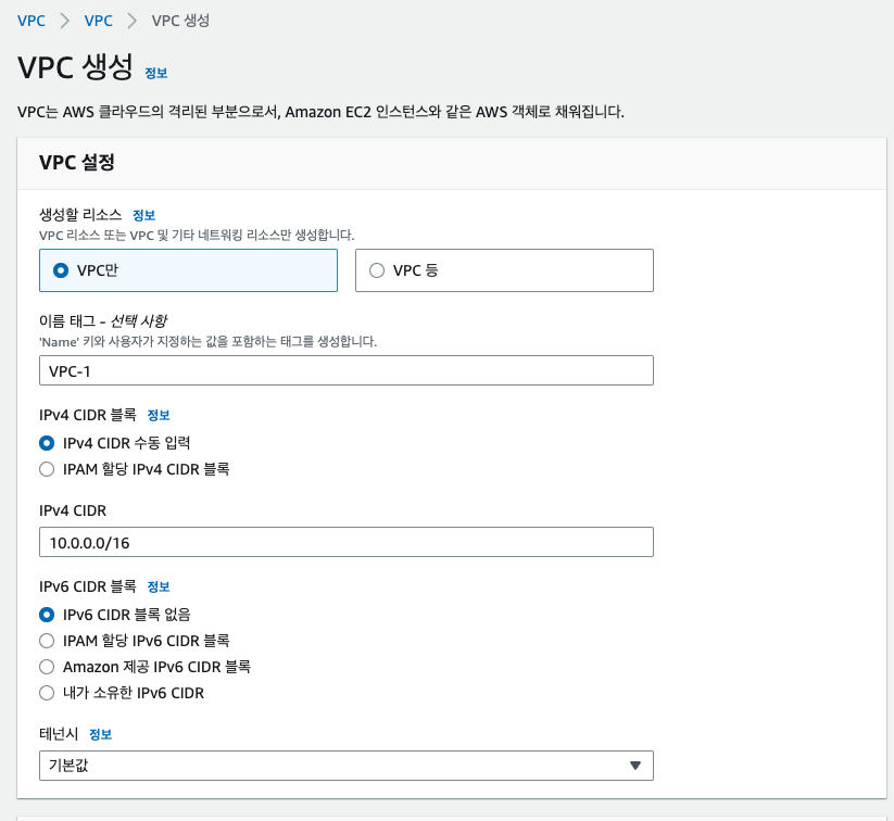 2. 이름 입력 후 IPv4 CIDR(IP 할당하는 부분) 에 10.0.0.0/16 입력 (/16 ~ /28 범위의 cidr을 작성해야한다.)
