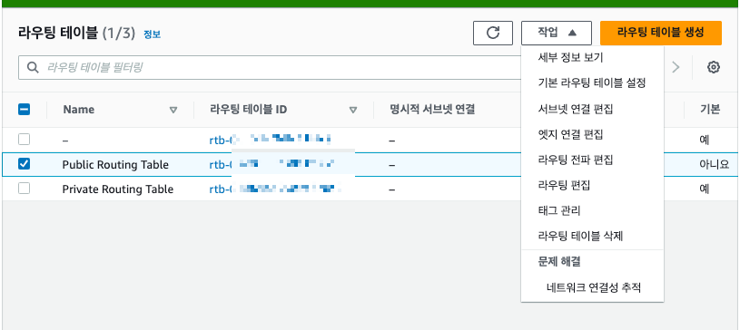 14. 생성한 퍼블릭 라우팅 체크박스 클릭 -> 작업 -> 라우팅 편집