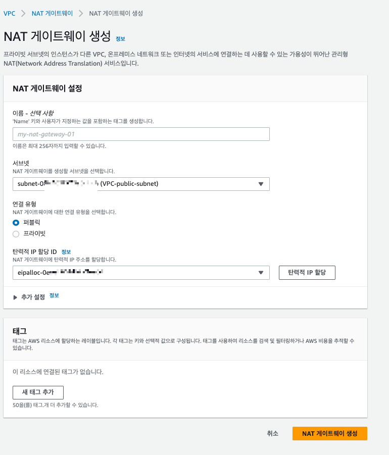 19. Public Subnet 선택 -> 탄력적 IP 할당 클릭 후 IP 부여 -> NAT 게이트웨이 생성 ( Private Subnet과 연결해주기 위해 미리 Public Subnet에 NAT 게이트웨이 세팅)