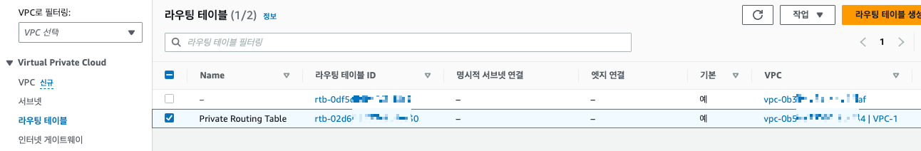 12. VPC가 생성한 라우팅 테이블 VPC이름을 보고 찾으면된다. 이 라우팅 테이블은 로컬로 라우팅하기 때문에 Private 라우팅으로 설정하면된다. (이름은 원래 - 였는데 Private Routing Table로 변경했다.)