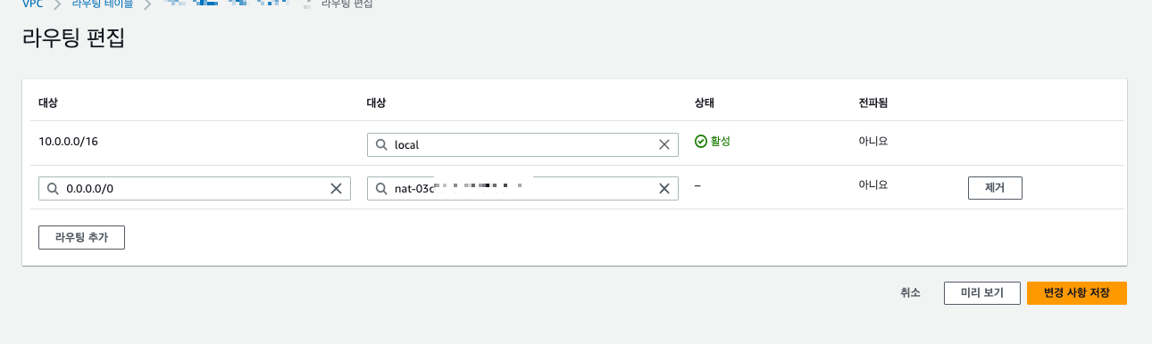 20. Private Routing Table 편집 -> 버튼 클릭 하면 밑과 같은 화면 노출 -> 라우팅 탭 선택 -> 라우팅 편집 클릭