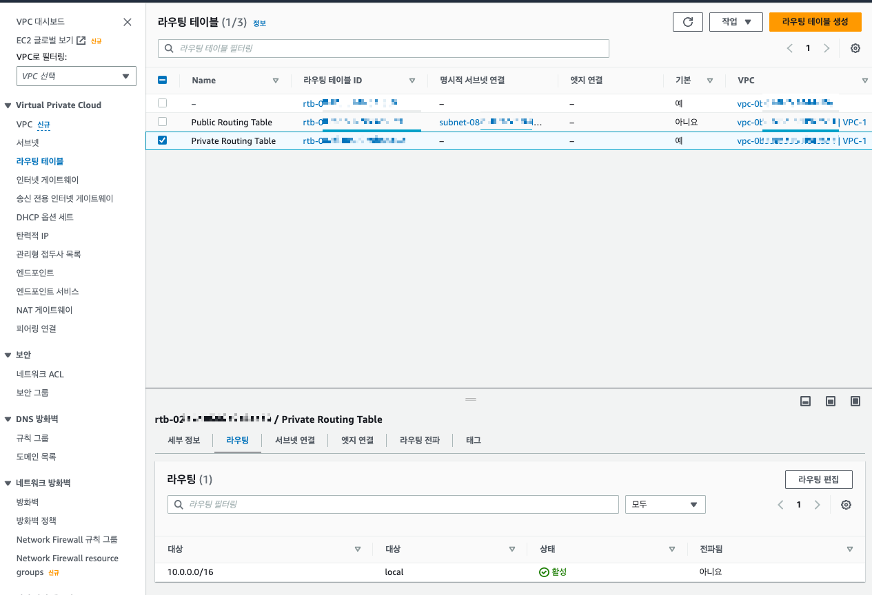 - Routing Table 설정(라우팅 테이블에는 서브넷 또는 게이트웨이의 네트워크 트래픽이 전송되는 위치를 결정하는 라우팅이라는 규칙 세트가 포함되어 있습니다.)