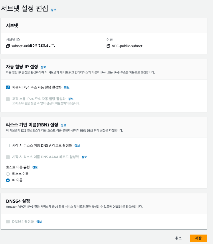 7. 퍼블릭 IPv4 주소 자동 할당 활성화 클릭 후 저장 (해당 설정을 해야 공인 IP로 Public Subnet은 인터넷 게이트웨이와 연결되어 외부에서 접근이 가능하다.)