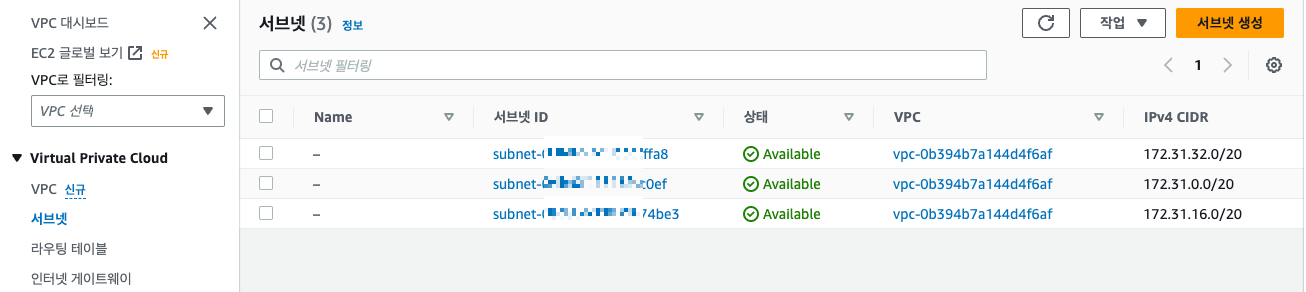 4. public subnet 생성 -> 서브넷 생성 클릭