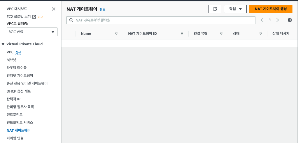 - NAT(Network Address Transalation, 네트워크 주소 변환) 게이트웨이 설정(private subnet의 인스턴스가 vpc 외부의 서비스를 연결할 수 있지만 외부 서비스는 연결을 못한다.