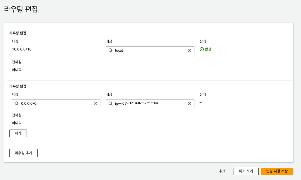 15. 라우팅 추가 -> 대상 선택 -> 대상 인터넷 게이트웨이 선택 -> 생성한 게이트웨이 선택 ( 퍼블릭에서 접근 가능하게 설정)
