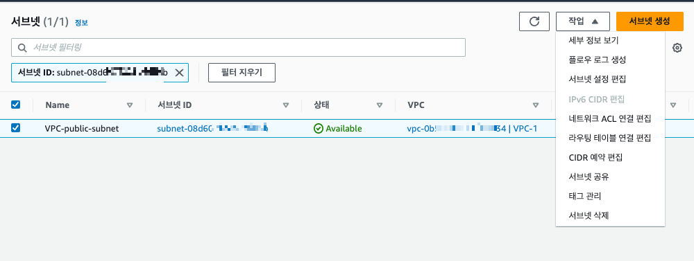 6. 생성한 subnet 클릭 -> 서브넷 설정 편집 클릭