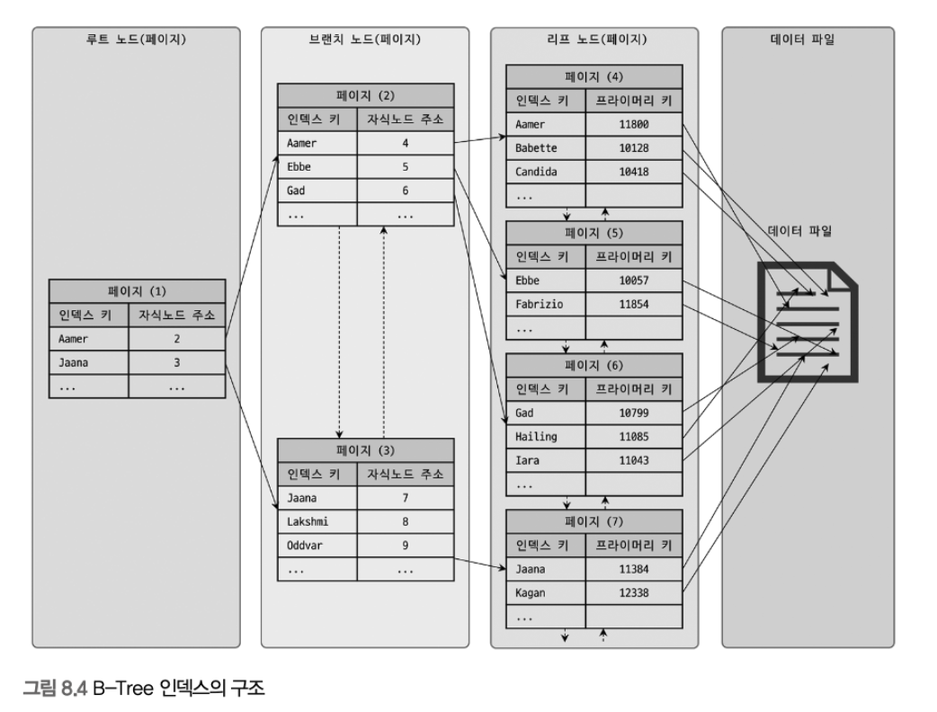 - 디스크에 데이터를 저장하는 가장 기본 단위를 페이지(Page) 또는 블록(Block)이라 한다. 디스크의 모든 읽기 및 쓰기 작업의 최소 작업 단위가 된다. 인덱스도 결국은 페이지 단위로 관리되며 루트와 브랜치, 그리고 리프 노드를 구분한 기준이 바로 페이지 단위이다.