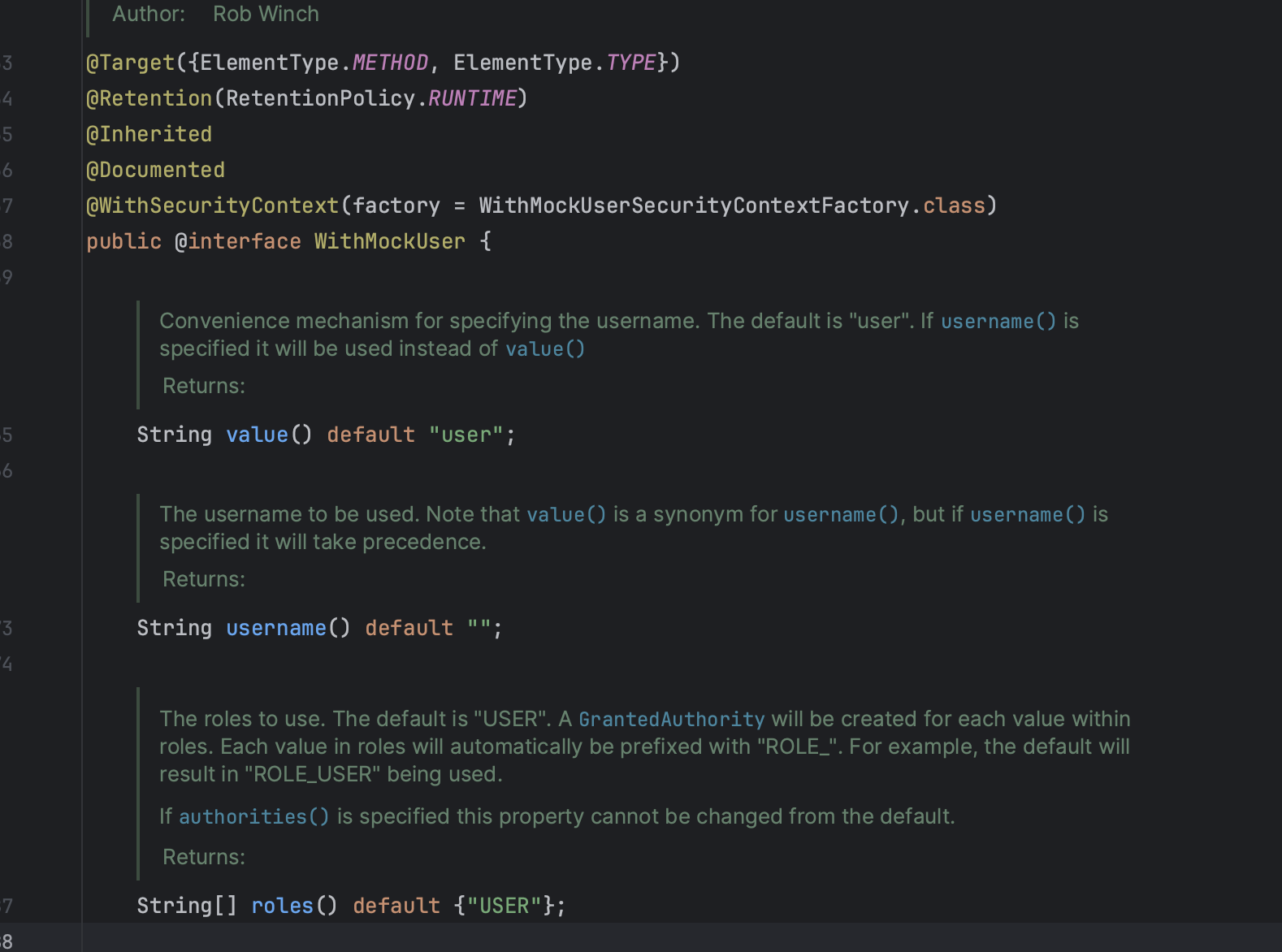 - 인증만 모킹할 경우에는 스프링 시큐리티 테스트 패키지에서 제공하는 @WithMockUser 를 사용하면 된다.(밑에는 해당 어노테이션 내부 코드다.)