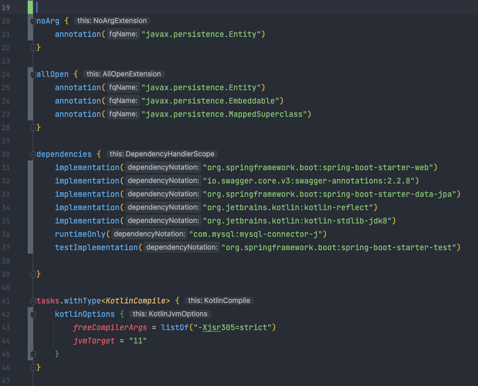 - noArg : @Entity가 달린 엔티티 클래스에 기본 생성자를 생성해주기위에 noarg 플러그인 사용 - 만약 이 플러그인을 적용안하면 컴파일 에러는 발생을 안하지만 쿼리가 날라갈 때 에러가 발생한다.
