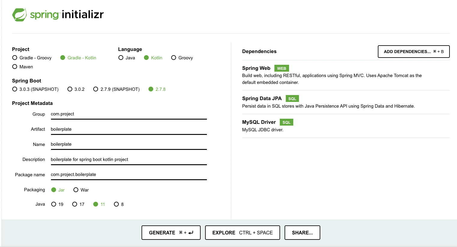 1. https://start.spring.io/ 에서 밑과 같이 의존성 설정 후 생성 (DB는 취향껏, java 11버전이라 스프링 부트 버전 2.7.8로 선택했다. - 스프링 부트 3.0 버전 이상은 자바 17버전으로만 사용 가능)