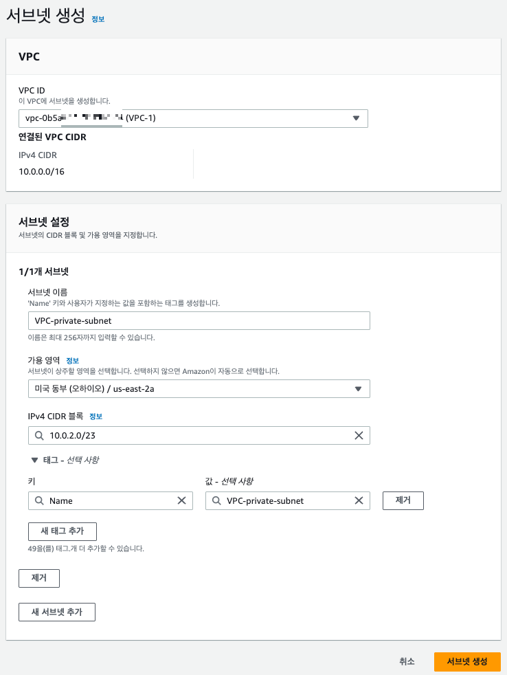 9. Public Subnet처럼 생성(같은 vpc, 서브넷 이름 설정, 같은 가용 영역) -> 하지만 IPv4 CIDR 블록은 10.0.2.0/23로 설정.